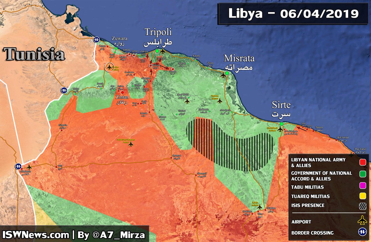 Στις 5 Απριλίου, ο Χαφτάρ ανακοίνωσε ότι έχει καταλάβει σειρά από κοινότητες και χωριά περιμετρικά της Τρίπολης και ότι απέχει περίπου 30 χιλιόμετρα από την πόλη. Ο γενικός γραμματέας του ΟΗΕ Αντόνιο Γκουτέρες σπεύδει στη Βεγγάζη και δηλώνει «βαθιά ανήσυχος» μετά τη συνάντησή του με τον Χάφταρ.