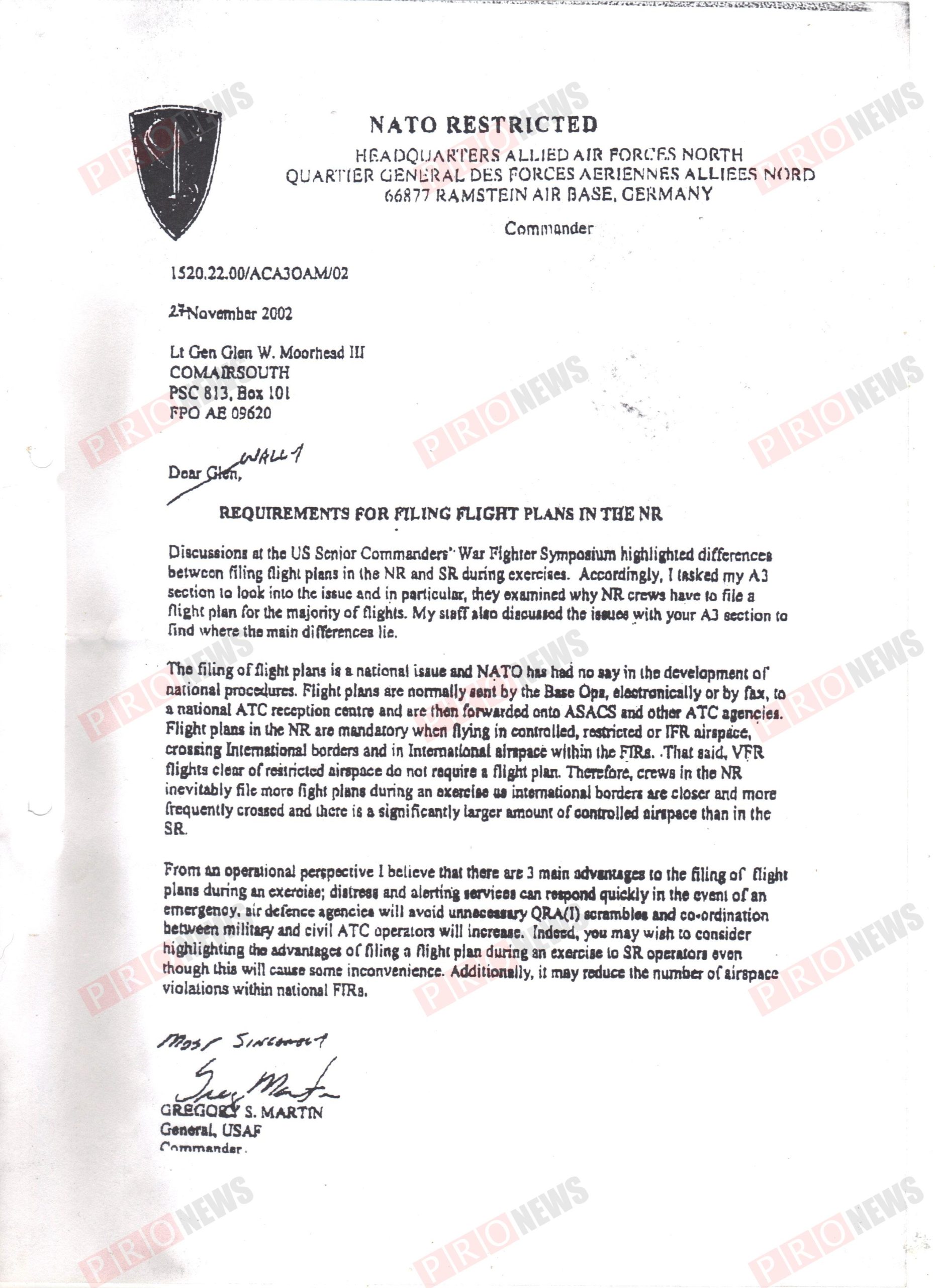Ύστερα από σειρά συσκέψεων, ο διοικητής των ΗΠΑ στο RAMSTEIN, πτέραρχος Gregory MARTIN που περιλαμβάνεται στο Βόρειο Τομέα του ΝΑΤΟ απέστειλε έγγραφο στον COMAIR SOUTH, υπεύθυνο για τη Νότια Πτέρυγα του ΝΑΤΟ σχετικά με τα σχέδια πτήσης, περνώντας γενεές δεκατέσσερις το ΝΑΤΟ για τη μη κατάθεση σχεδίων πτήσης στη Νότια Πτέρυγα (δηλαδή από την Τουρκία) και εμμέσως διασύρει το ελληνικό πολιτικό σύστημα για την αδράνεια του να επιβάλει την κατάθεση σχεδίων πτήσης και να προασπίσει τα ελληνικά συμφέροντα.