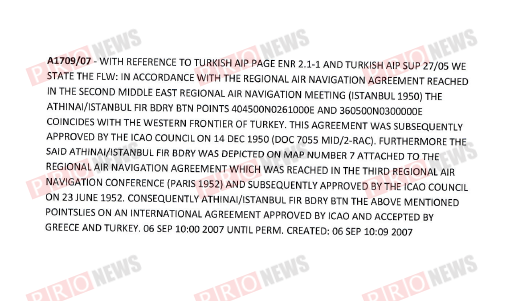 Δηλαδή, η ελληνική απάντηση που αναγράφεται στις ΝΟΤΑΜ της ΥΠΑ προς σύμπασα τη διεθνή κοινότητα αναφέρεται στην απόφαση του ICAO του 1950 (που είχε συνταταγμένες 3555Ν-3000 Ε), άλλα διαγράφει αυθαιρέτως τις συντεταγμένες αυτές και προσθέτει τις συντεταγμένες 3605Ν- 3000 Ε , οι οποίες περιλαμβάνονται στην «χαμένη» απόφαση του 1958.