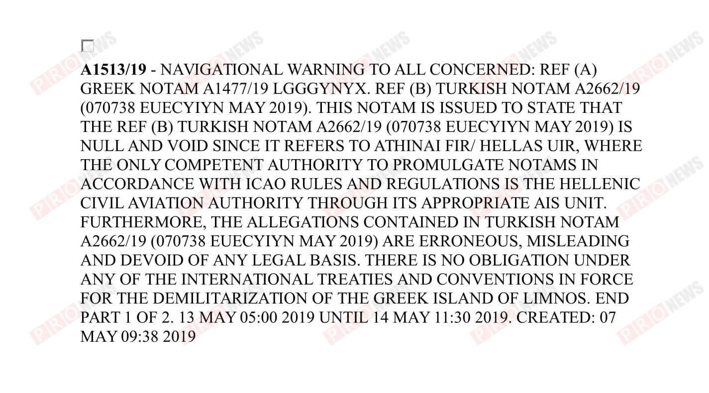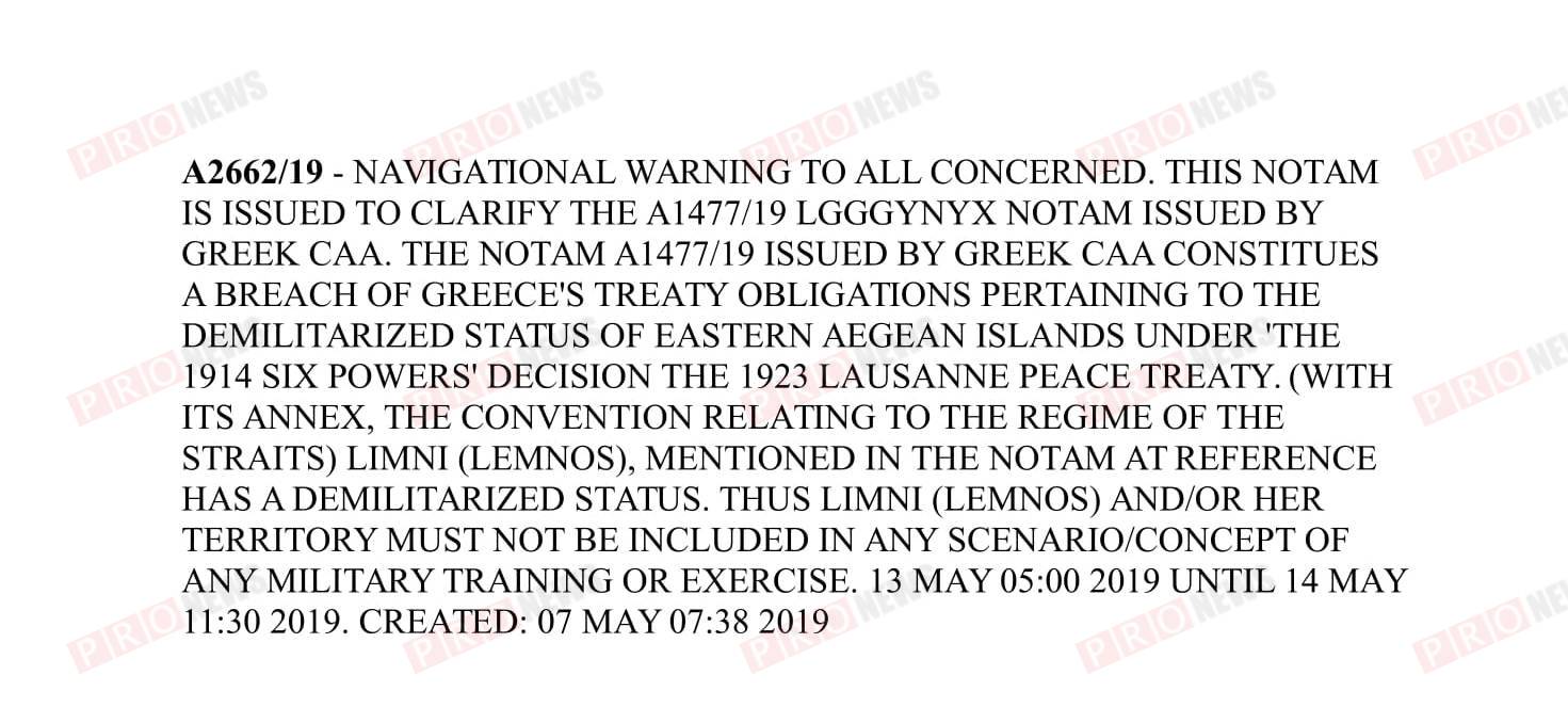 Η Τουρκία με τη ΝΟΤΑΜ Α2662/7 Μαΐου 2019, επαναλαμβάνει ότι η Λήμνος είναι αποστρατιωτικοποιημένη και γι’ αυτό απαγορεύονται τόσο οι ασκήσεις όσο και οι εκπαιδευτικές πτήσεις, (σσ. τις οποίες η Τουρκία διενεργεί κατά κόρον παρανόμως).