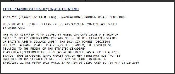 Και σαν να μην έφτανε αυτό η Τουρκία με νέα ΝΟΤΑΜ την Α2795/19 αναφέρουν ότι η ΝΟΤΑΜ Α1574/19 που έχει εκδώσει η Ελλάδα για ασκήσεις στην περιοχή της Σαμοθράκης παραβιάζει τους κανόνες της συνθήκες του 1914 και της Λωζάννης του 1923 πε3ρί αποστρατικοποιημέςνου καθεστώτος των νησιών του Α.Αιγαίου συμπεριλαμβανομένης και της Σαμοθράκης με αποτέλεσμα να θεωρείται «παράνομη» και ως εκ τούτου καλεί να μην πραγματοποιηθεί καμιά άσκηση στην συγκεκριμένη περιοχή.