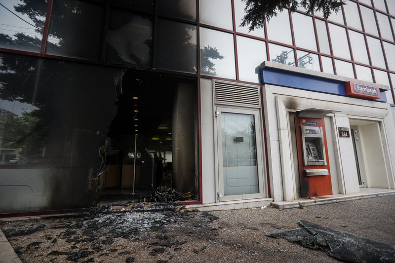 Μια άλλη ομάδα προξένησε φθορές με βαριοπούλες στους υαλοπίνακες και την οθόνη του ΑΤΜ, στο υποκατάστημα της Εθνικής Τράπεζας, στην οδό Φορμίωνος 141 στο Βύρωνα.