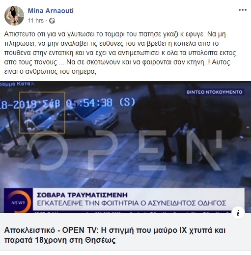 «Απίστευτο ότι για να γλυτώσει το τομάρι του πάτησε γκάζι και έφυγε. Να μη πληρώσει, να μην αναλάβει τις ευθύνες του να βρεθεί η κοπέλα από το πουθενά στην εντατική και να έχει να αντιμετωπίσει και όλα τα υπόλοιπα εκτός από τους πόνους … Να σε σκοτώνουν και να φέρονται σαν κτήνη..! Αυτός είναι ο άνθρωπος του σήμερα;», έγραψε χαρακτηριστικά.