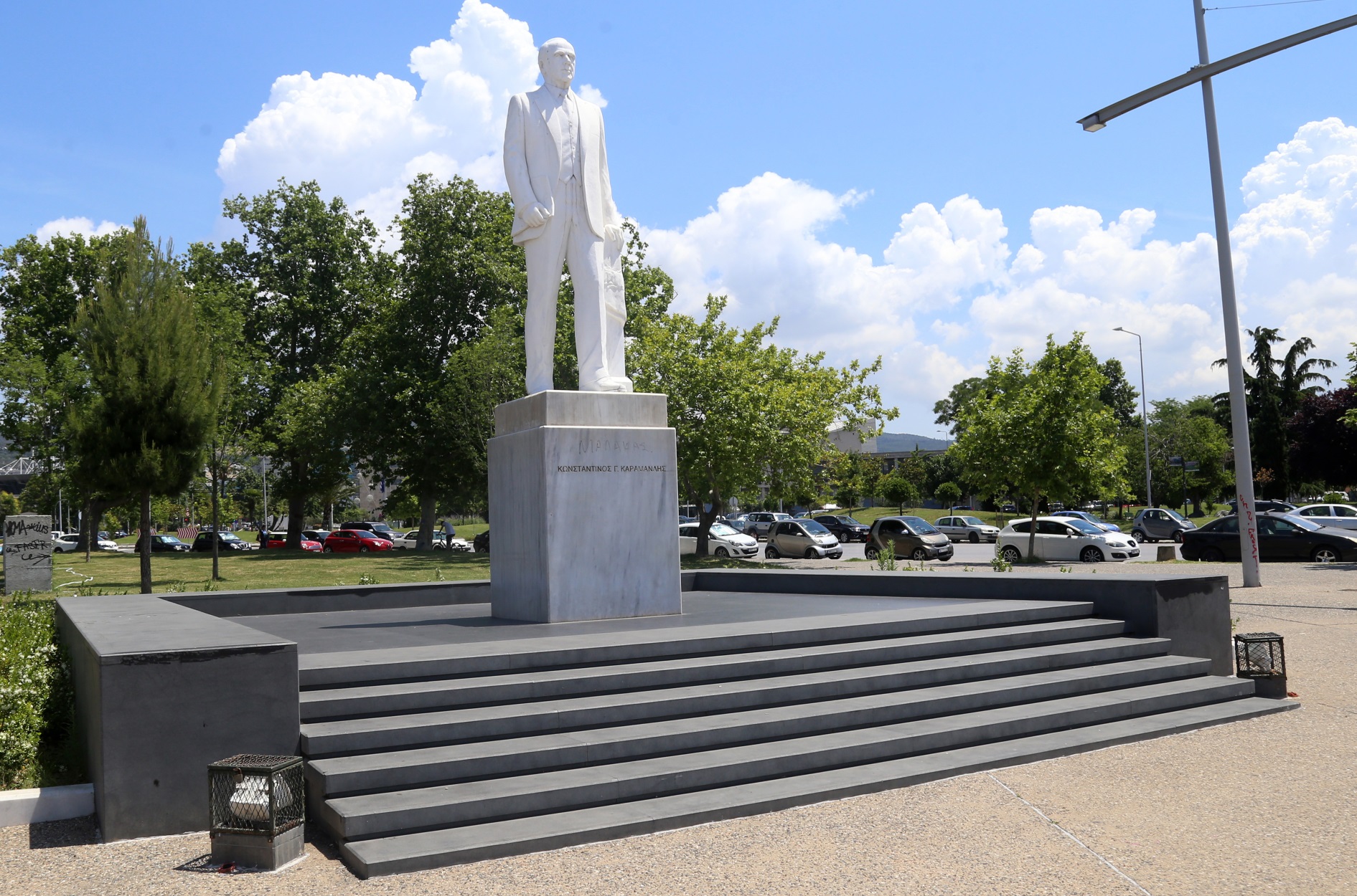 Το άγαλμα του Κωνσταντίνου Καραμανλή που βρίσκεται στη Νέα Παραλία, στη Θεσσαλονίκη, βανδάλισαν άγνωστοι.