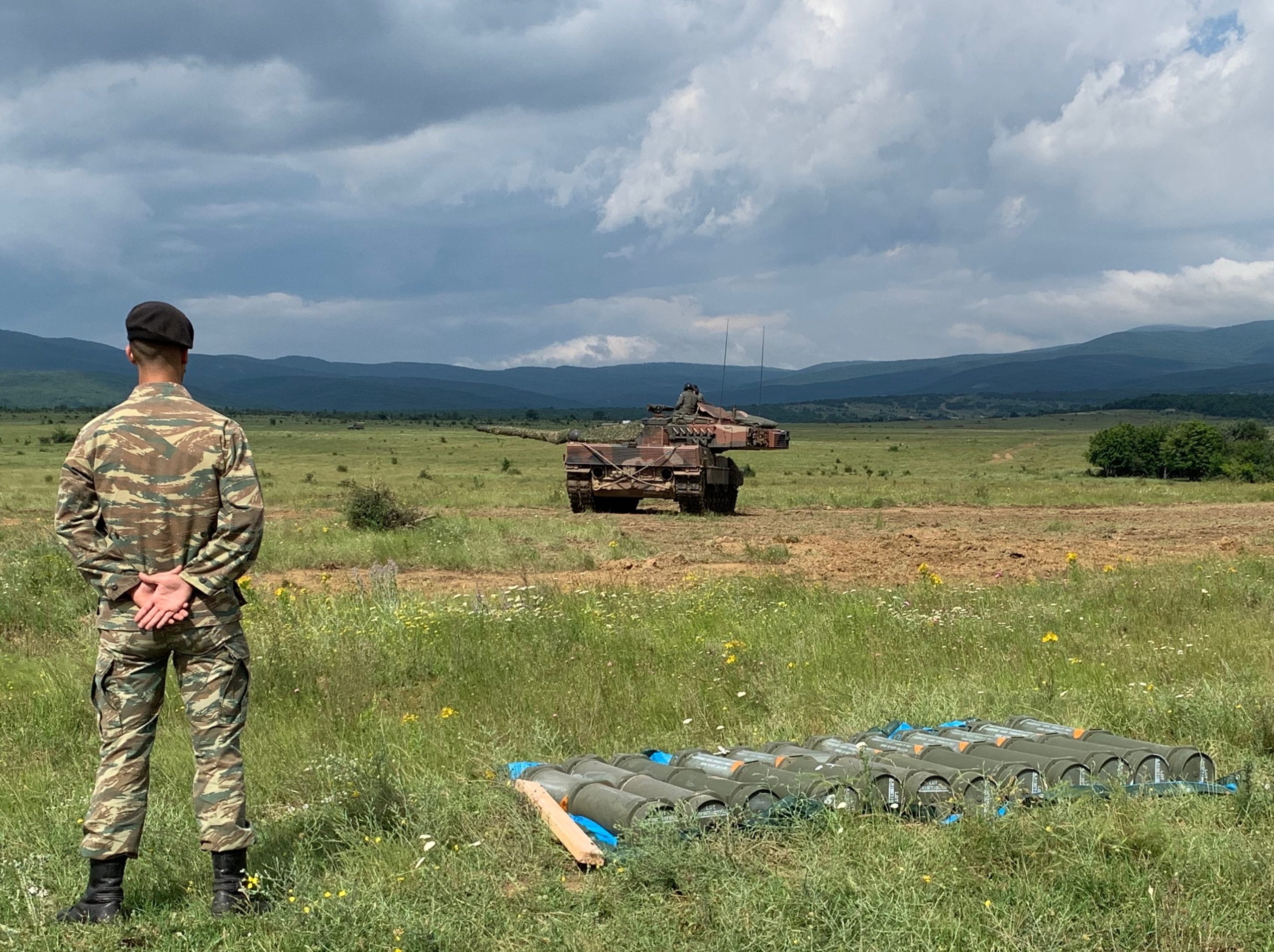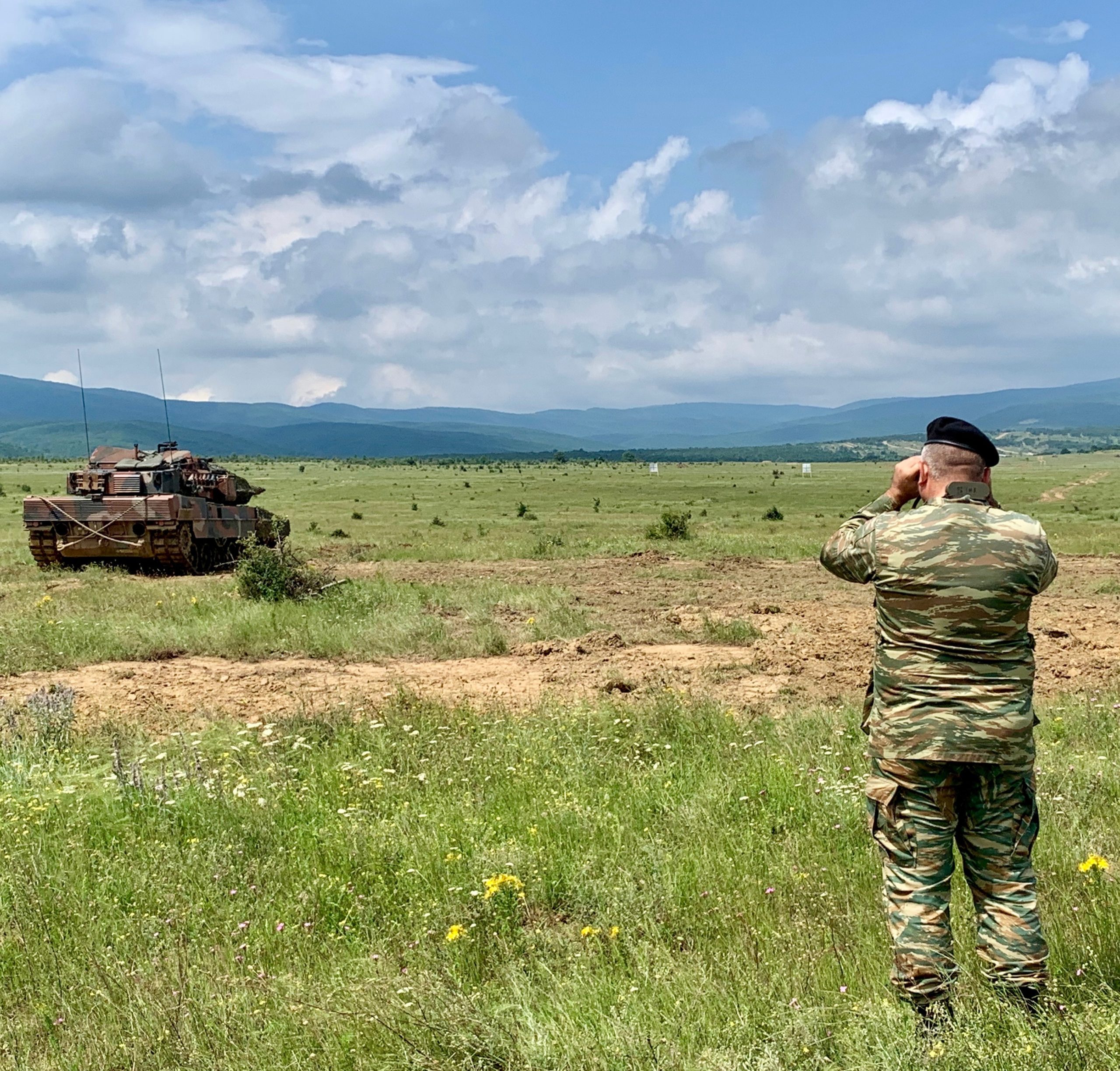 Σε μια φωτογραφία διακρίνεται ο αντισυνταγματάρχης Αδαμάντιος Μελίδης, διοικητής της 22ης ΕΜΑ (όπως αναφέρεται στο αγγλικό κείμενο), να παρατηρεί τη βολή ενός Leopard 2HEL, ενώ ένας άνδρας της 22 ΕΜΑ εκτελεί καθήκοντα δείκτη για τον χώρο που έχουν αποτεθεί τα βλήματα ασκήσεων που χρησιμοποιήθηκαν στη βολή.