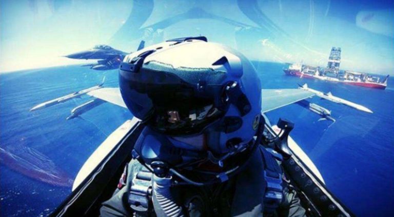 Πιλότοι τουρκικών F-16 απαθανάτισαν την πτήση τους πάνω από το γεωτρύπανο κατά τη διάρκεια του πλου του και τη δημοσίευσαν, θέλοντας να κάνουν επίδειξη δύναμης και να προκαλέσουν εκ νέου.