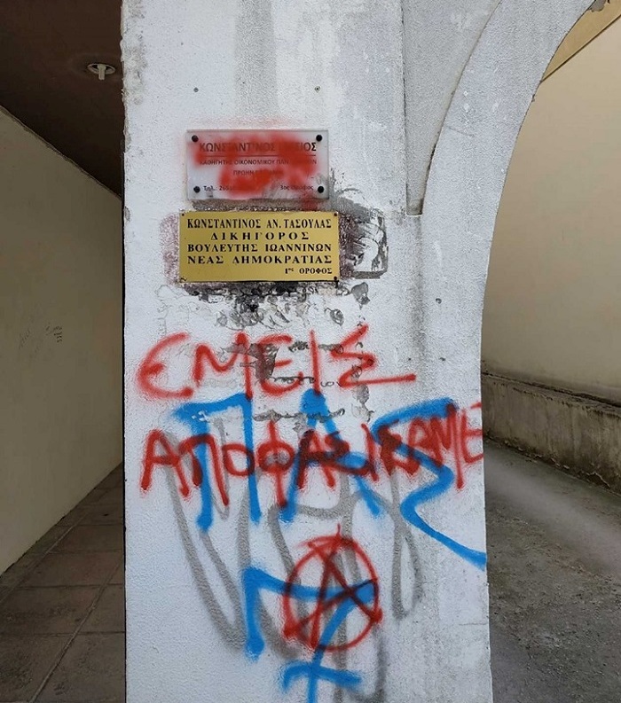 Οπως αναφέρει το epiruspost.gr το πρωί του Σαββάτου ο υποψήφιος βουλευτής του Κινήματος Αλλαγής Κώστας Γάτσιος αντίκρισε τις εικόνες με τους βανδαλισμούς στην είσοδο των γραφείων του, στην οδό Μιχαήλ Αγγέλου, ενώ σύμφωνα με πληροφορίες ίδια ήταν η εικόνα και στα γραφεία του υποψηφίου βουλευτή της Νέας Δημοκρατίας Κώστα Τασούλα, που βρίσκεται στο ίδιο τετράγωνο.