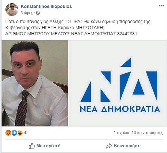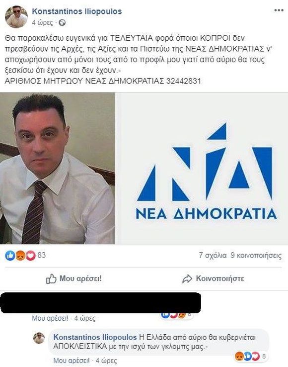 Αξιωματικός της ΕΛΑΣ, σε μια ανάρτηση στον τοίχο τους γράφει: «Θα παρακαλέσω ευγενικά για τελευταία φορά όποιοι ΚΟΠΡΟΙ δεν πρεσβεύουν τις αρχές, τις αξίες και τα πιστεύω της Νέας Δημοκρατίας να αποχωρήσουν από μόνοι τους από το προφίλ μου γιατί από αύριο θα τους ξεσκίσω ότι έχουν και δεν έχουν.» Και στη συνέχεια σαν καλός δεξιός ο αστυνομικός υπογράφει: «Αριθμός Μητρώου Νέας Δημοκρατίας 32442831»