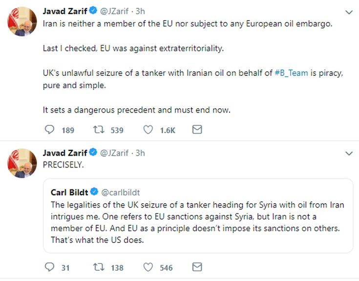 Την τελευταία φορά που το έλεγξα, η ΕΕ ήταν κατά της εξωεδαφικότητας. Η παράνομη σύλληψη από το Ηνωμένο Βασίλειο ενός δεξαμενόπλοιου που μετέφερε ιρανικό πετρέλαιο για λογαριασμό της #B-Team είναι πειρατεία, καθαρή και απλή. Δημιουργεί ένα επικίνδυνο προηγούμενο και πρέπει να τελειώσει τώρα», έγραψε ο Ζαρίφ σε ένα τουίτ.