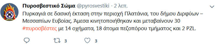 Σύμφωνα με την Πυροσβεστική, η πυρκαγιά ξέσπασε σε δασική έκταση στην περιοχή Πλατάνια, του δήμου Διρφύων – Μεσσαπίων Ευβοίας.