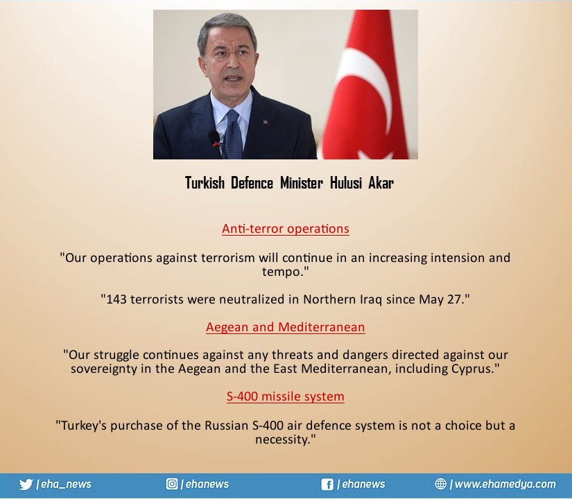 Ο Τούρκος ΥΠΑΜ, Χ.Ακάρ, είπε σε δηλώσεις του πως “οι επιχειρήσεις μας απέναντι στην τρομοκρατία θα συνεχιστούν με αυξημένο ρυθμό και ένταση. Ο αγώνας μας συνεχίζεται εναντίον απειλών και κινδύνων σε Αιγαίο, Ανατολική Μεσόγειο και Κύπρο. Η αγορά των S-400 δεν ήταν επιλογή αλλά αναγκαιότητα”.