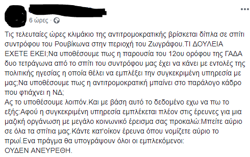 Την Αστυνομία να μπει μέσα στα σπίτια των «συντρόφων» προκαλεί ηγετικό στέλεχος του «Ρουβίκωνα», μέσω ανάρτησής του στο Facebook.