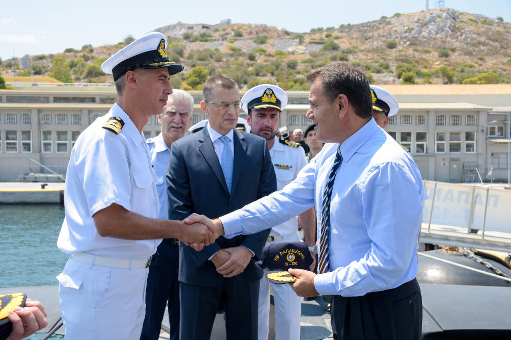 Τον υπουργό Αμυνας υποδέχτηκε ο Αρχηγός Στόλου Αντιναύαρχος Στυλιανός Πετράκης ΠΝ. Στην επίσκεψη παρέστη και ο Υφυπουργός Εθνικής Άμυνας κ. Αλκιβιάδης Στεφανής.