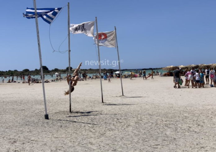 Με το στόμα ανοιχτό έμειναν όσοι βρέθηκαν το μεσημέρι της Τετάρτης στο Ελαφονήσι στα Χανιά, όταν είδαν μία γυναίκα να… ανεβαίνει στο κοντάρι με την ελληνική σημαία και να κάνει pole dancing.