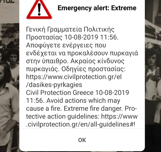Γενική γραμματεία πολιτικής προστασίας 10-08-2019 11:56. Αποφύγετε ενέργειες που ενδέχεται να προκαλέσουν πυρκαγιά στην ύπαιθρο. Ακραίος κίνδυνος πυρκαγιάς. Οδηγίες προστασίας civilprotection.gr. Το μήνυμα στέλνεται και στην αγγλική γλώσσα