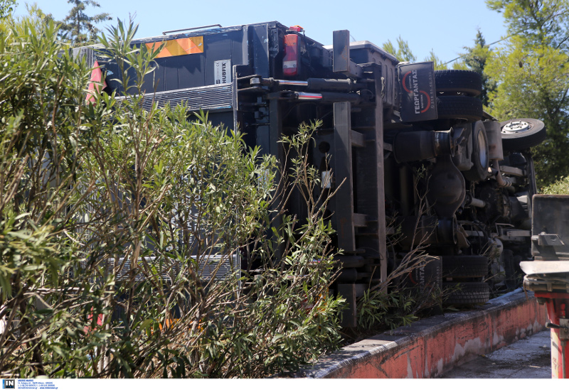 Μία νταλίκα έχασε τον έλεγχο και αναποδογύρισε στην έξοδο Τατοΐου στον κόμβο της Μεταμόρφωσης.