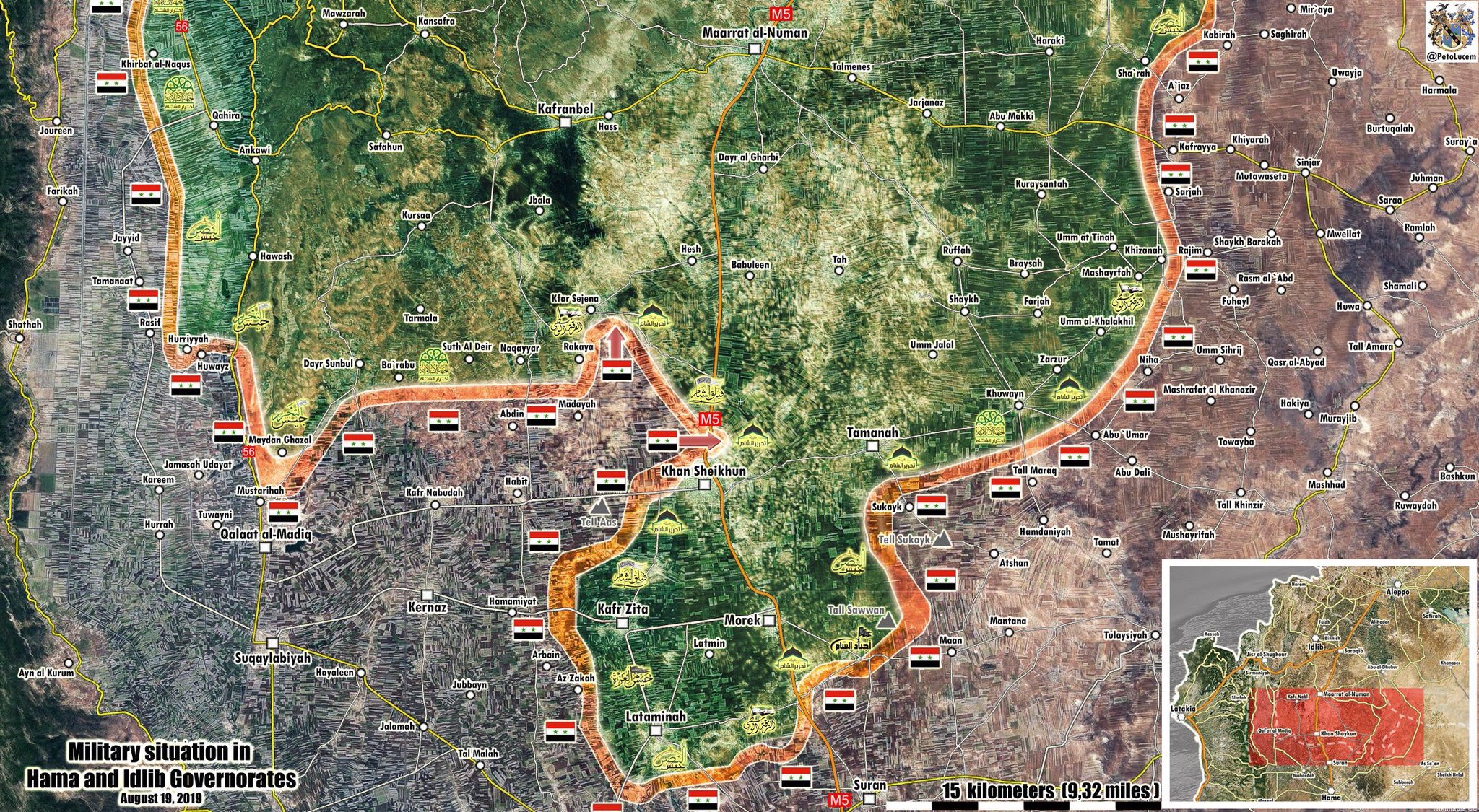Λίγο αργότερα ο Συριακός Στρατός “έκοψε” τον αυτοκινητόδρομο Μ5 που συνδέει Δαμασκό-Χαλέπι-Χομς και την Ιντλίμπ με το Μοrek. Οι συριακές δυνάμεις διέσχισαν τον Μ5 από δυτικά προς ανατολικά βόρεια της Khan Shaykhun ώστε να ελέγξουν περισσότερα υψώματα και έδαφος στα ανατολικά του δρόμου.