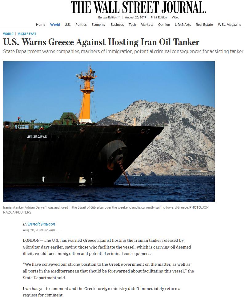 «Μεταφέραμε την ισχυρή θέση μας ως προς το θέμα αυτό στην ελληνική κυβέρνηση καθώς και σε όλα τα λιμάνια στη Μεσόγειο που πρέπει να προειδοποιηθούν για να μη διευκολύνουν αυτό το τάνκερ», είπε το Στέιτ Ντιπάρτμεντ, σύμφωνα με τη Wall Street Journal. Και πρόσθεσε: