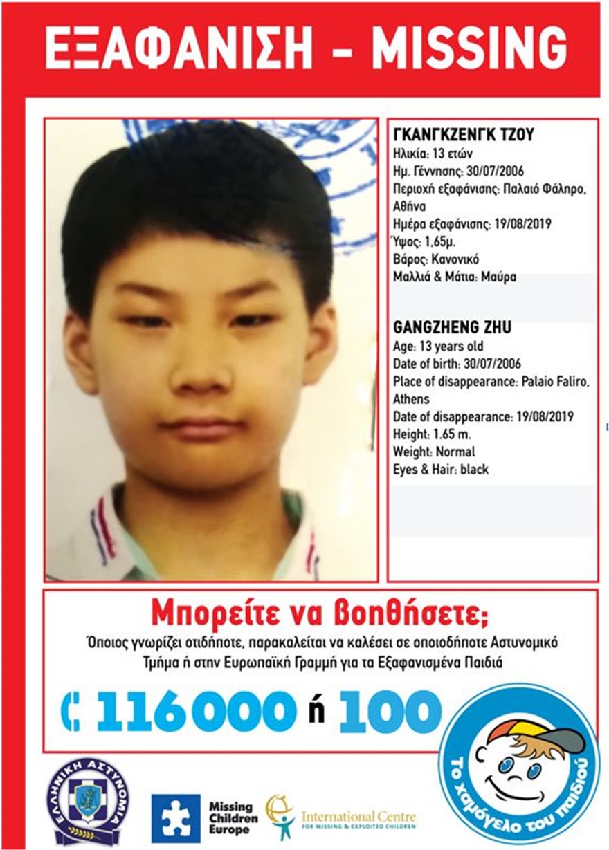 Εξαφανίστηκε από το σπίτι του, στο Παλαιό Φάληρο, ο κινεζικής καταγωγής 13χρονος Γκανγκζένγκ Τζου. Αγνοείται για πάνω από δύο 24ωρα και συγκεκριμένα από τις 19:30, το απόγευμα της Δευτέρας.