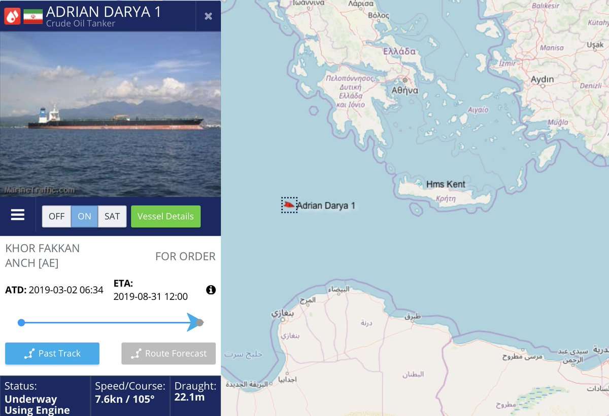 Τη στιγμή αυτή το ιρανικό δεξαμενόπλοιο Adrian Darya 1 (πρώην Grace 1), πλέει δυτικά της Κρήτης, σύμφωνα με το στίγμα του που αποτυπώνεται στο marinetraffic.