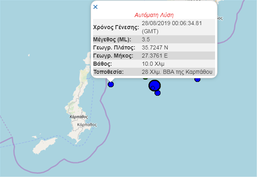 Σεισμική δόνηση μεγέθους 3,5 βαθμών της κλίμακας Ρίχτερ σημειώθηκε στις 3:12 μετά τα μεσάνυχτα, στη θαλάσσια περιοχή ανοιχτά της Καρπάθου.