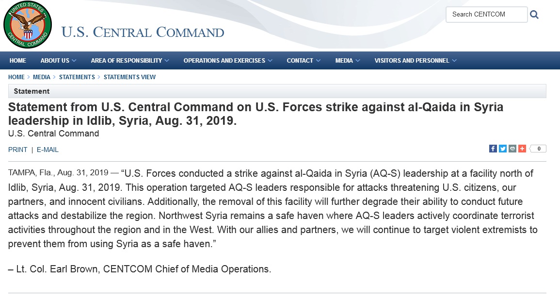 Η αμερικανική κεντρική διοίκηση U.S. Central Command με ανακοίνωσή της επιβεβαίωσε τις επιθέσεις σήμερα το πρωί κατά βάσης της τρομοκρατικής οργάνωσης Hurras Al-Deen η οποία αναφέρεται από το Πεντάγωνο ως AQ-S (al-Qaeda-Syria) λέγοντας πως η οργάνωση απειλούσε :αμερικανούς πολίτες και συμφέροντα των ΗΠΑ στην περιοχή.