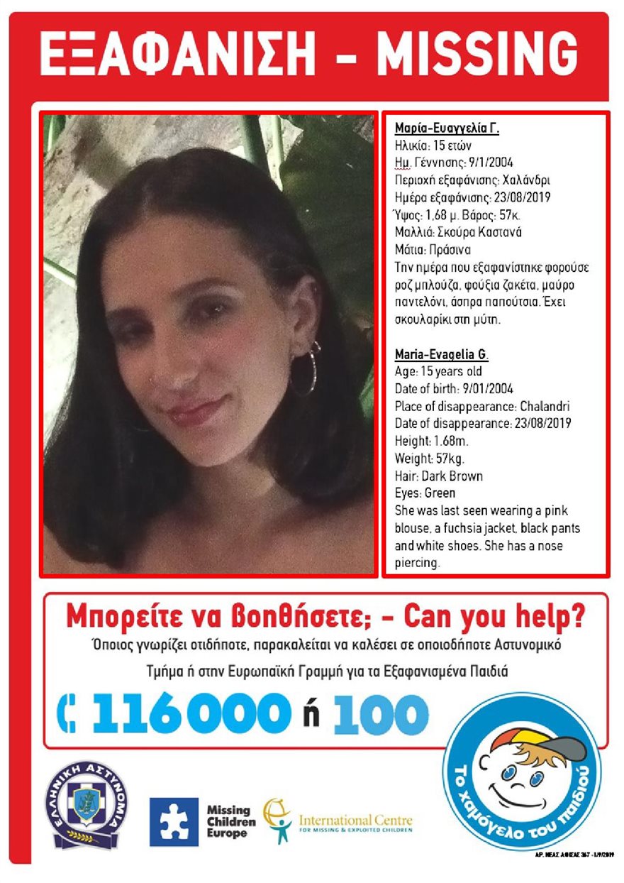 Η Μαρία-Ευαγγελία Γ. αγνοείται από τις 23 Αυγούστου. Έχει ύψος 1,68 μ., έχει 57 κιλά βάρος, σκούρα καστανά μαλλιά και πράσινα μάτια.