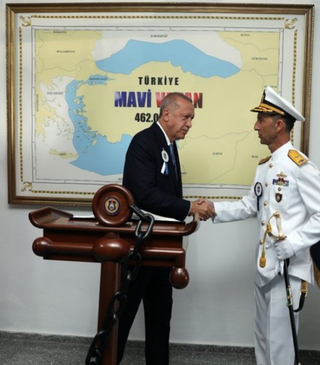 Ο ίδιος ο Τούρκος πρόεδρος Ρ.Τ.Ερντογάν φωτογραφήθηκε μπροστά στον συγκεκριμένο χάρτη (φωτό) ενώ υπέγραφε στο βιβλίο επισκεπτών της Σχολής Αξιωματικών του τουρκικού Ναυτικού (Deniz Harp Okulu), της αντίστοιχης Σχολής Δοκίμων του ΠΝ.