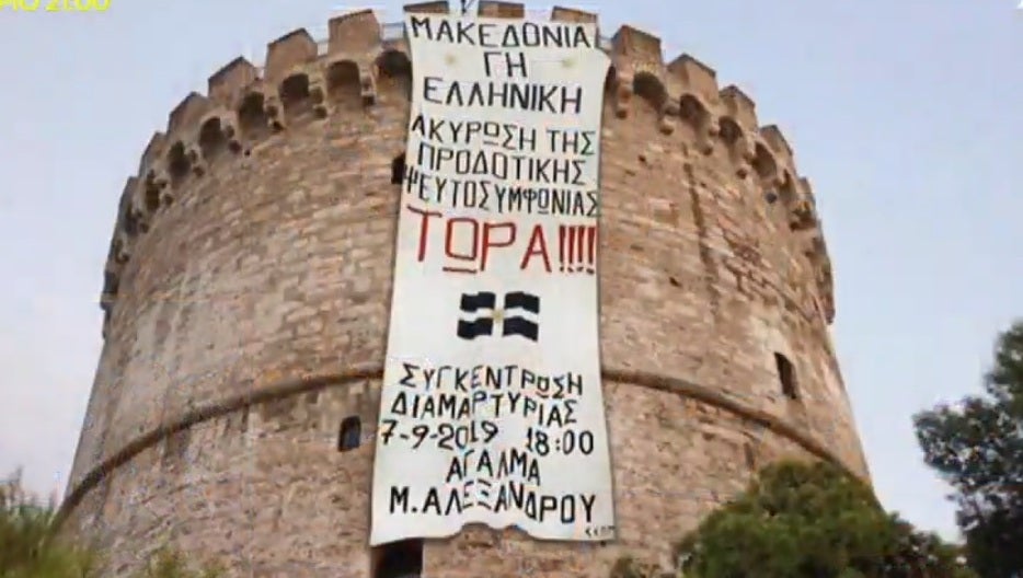 Το πρωί του Σαββάτου στον Λευκό Πύργο αναρτήθηκε πανό που καλεί σε συμμετοχή σε συλλαλητήριο το απόγευμα με αίτημα την «ακύρωσης της προδοτικής ψευτοσυμφωνίας των Πρεσπών».