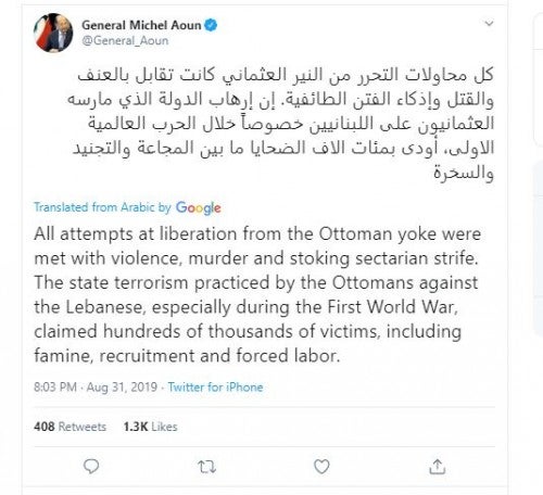 Συγκεκριμένα ο Αουν με αφορμή την 100η επέτειο από την ίδρυση του κράτους του Λιβάνου κατηγόρησε την Οθωμανική αυτοκρατορία «για κρατική τρομοκρατία» στα εδάφη της περιοχής τότε.