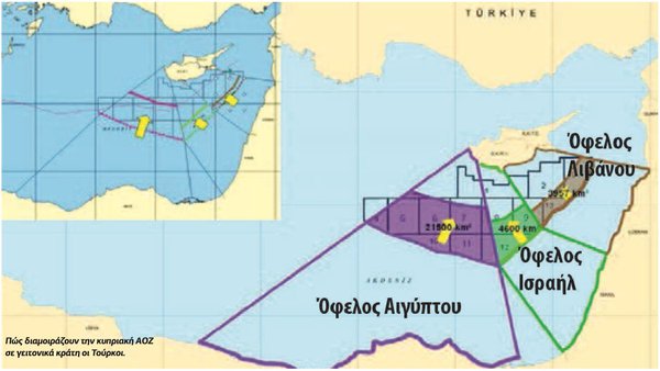 Υπενθυμίζουμε πως σύμφωνα με τον τουρκικό σχεδιασμό για ανακατανομή της κυπριακής ΑΟΖ, το 25% θα πήγαινε σε Αίγυπτο, Ισραήλ και Λίβανο με την Αγκυρα να παίρνει το 41%, να αφήνει το 34% στην ομοσπονδία και να περιορίζει την Κύπρο μόλις στο 6%!