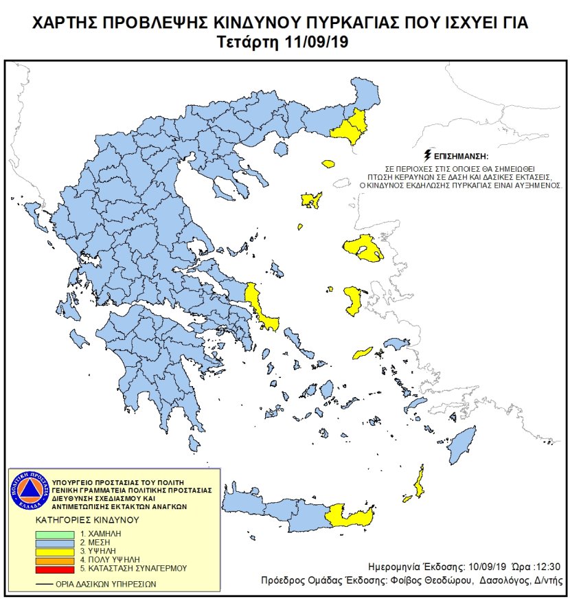 Όπως υποδεικνύει ο σχετικός χάρτης κίνδυνος επιπέδου 3 για την εκδήλωση φωτιάς παρουσιάζεται σε Ν. Εύβοια, Έβρο, Σαμοθράκη, Λήμνο, Λέσβο, Χίο, Ικαρία, Κάρπαθο και Λασίθι.