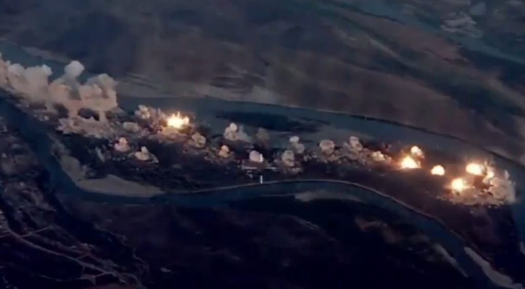 Το εντυπωσιακό βίντεο που ανήρτησε στο Twitter η συμμαχία δείχνει μαζικές εκρήξεις να συγκλονίζουν το νησί Κάνους στην επαρχία Σαλαχεντίν βόρεια της Βαγδάτης, και μανιτάρια καπνού να σηκώνονται στον ουρανό καθώς είναι σε εξέλιξη ο βομβαρδισμός-“χαλί”.