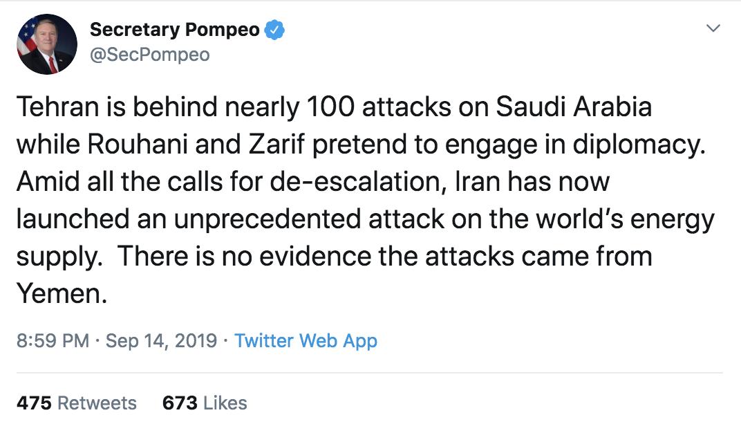 Ο Αμερικανός όμως υπουργός Εξωτερικών Μάικ Πομπέο δίνει μια άλλη ερμηνεία, λέγοντας πως δεν υπάρχει καμία ένδειξη ότι η επίθεση αυτή ξεκίνησε από την Υεμένη, δείχνοντας καθαρά το Ιράν!