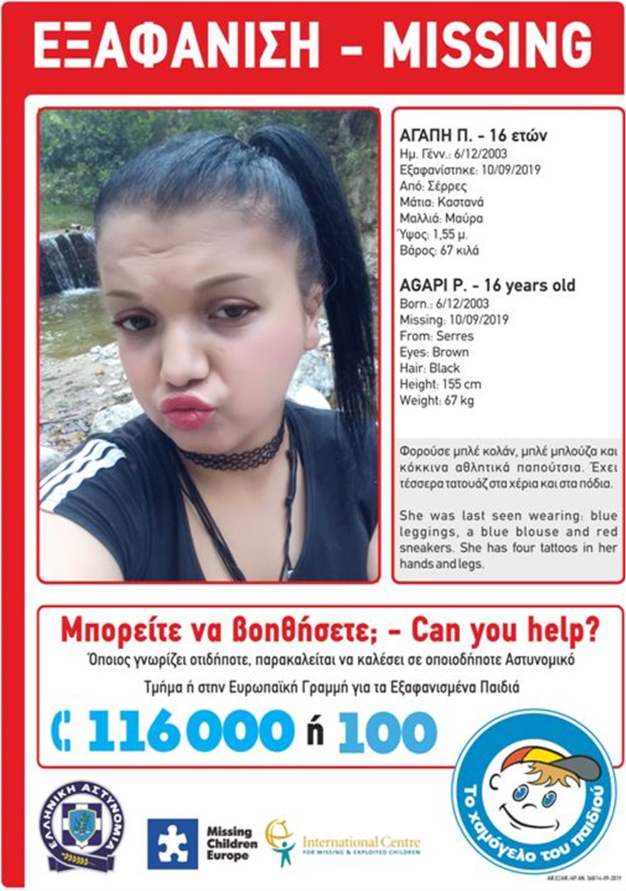 Στις 10/09/2019 και ώρα 21:30, εξαφανίστηκε από την περιοχή των Σερρών, η Αγάπη Π., 16 ετών.
