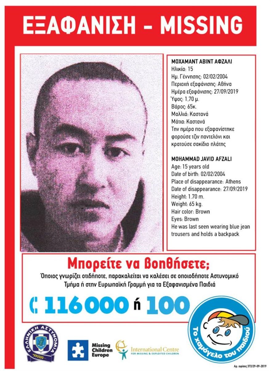 Συναγερμός έχει σημάνει για την εξαφάνιση 15χρονου. Εξαφανίστηκε από την περιοχή της Αθήνας, την Παρασκευή το απόγευμα, ο Μοχαμάντ Αβίντ Αφζαλί.
