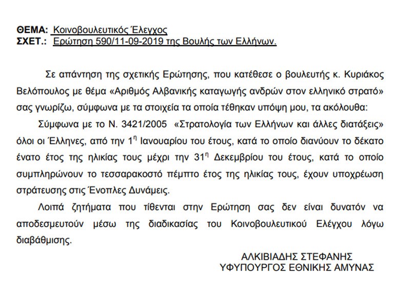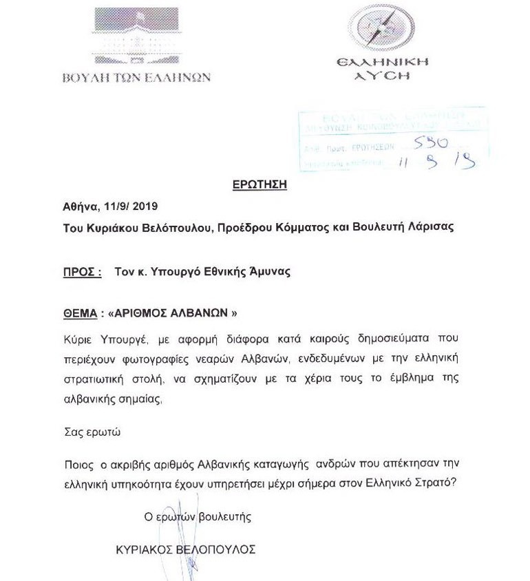 «Σε πλήρη και αδικαιολόγητη άρνηση να παράσχει στοιχεία περί του ακριβούς αριθμού ανδρών αλβανικής καταγωγής που έχουν μέχρι σήμερα υπηρετήσει στον Ελληνικό Στρατό προέβη ο Υπουργός Εθνικής Άμυνας κ. Παναγιωτόπουλος, μέσω της απάντησής του στη σχετική ερώτηση του Προέδρου της Ελληνικής Λύσης κ. Βελόπουλου.