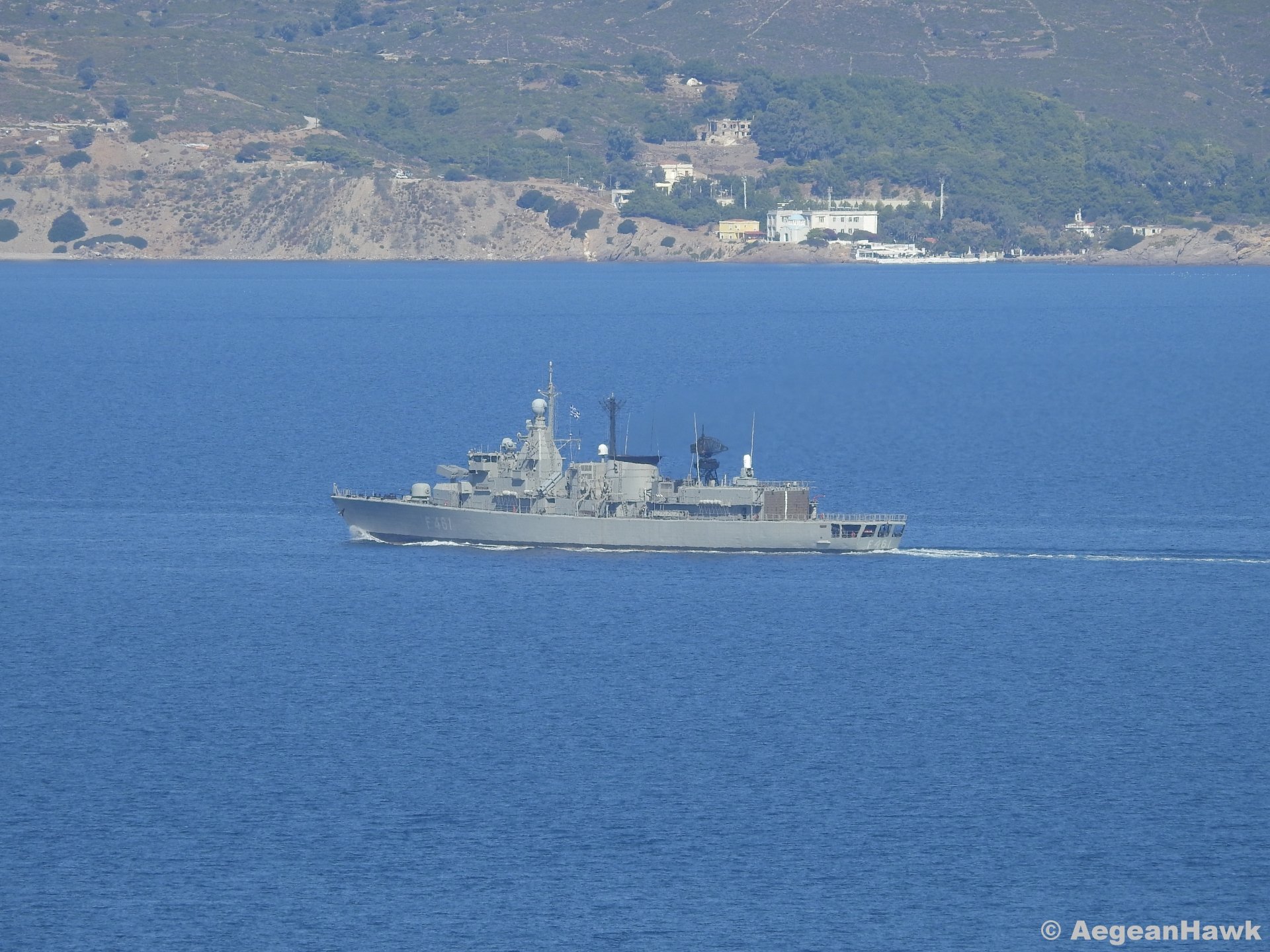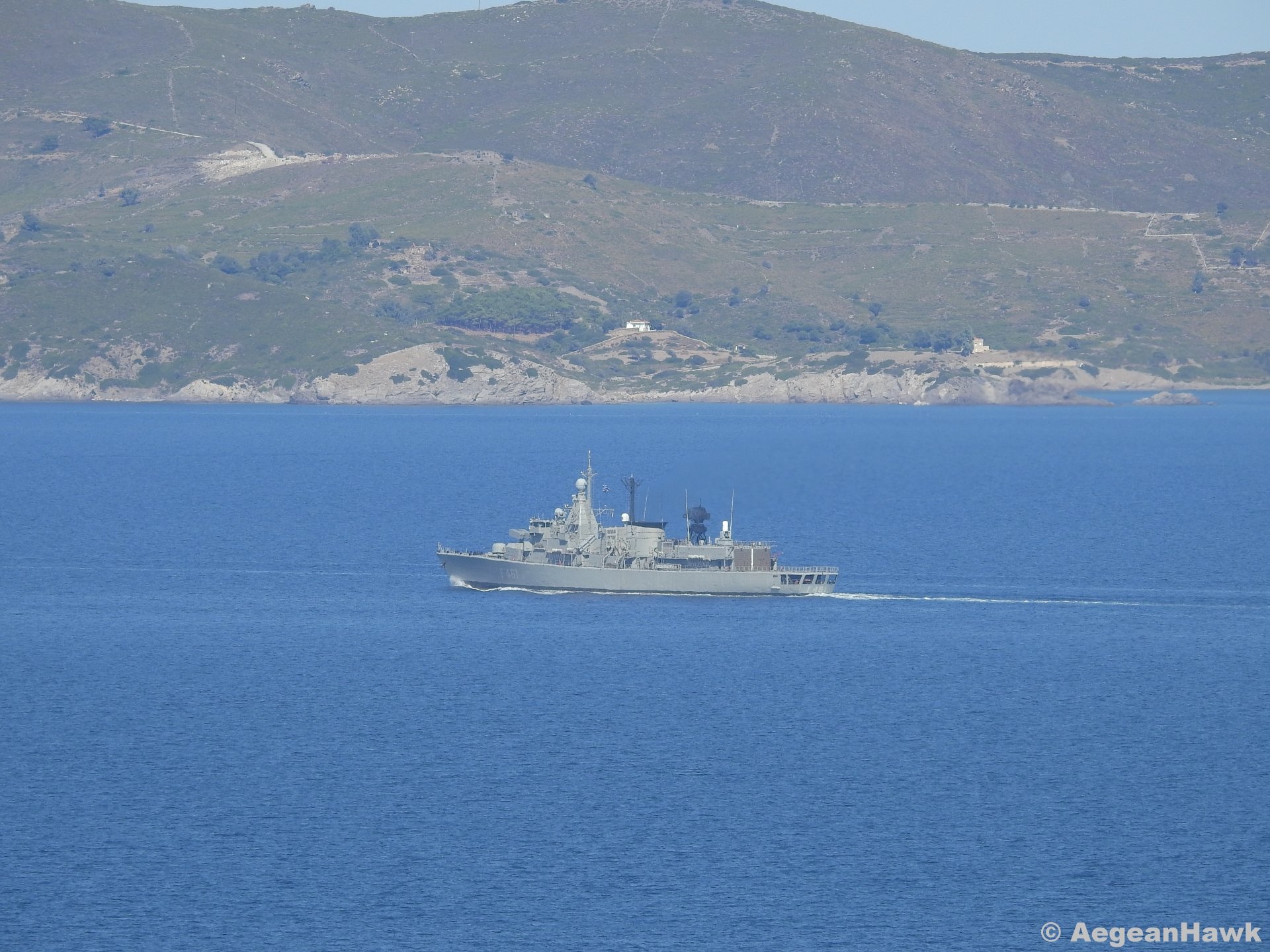 Η παλιά φρεγάτα του Πολεμικού Ναυτικού F461 «Ναβαρίνον», κλάσης «S» πλησιάζει τις Οινούσσες από το στενό της Χίου, κατά τη διάρκεια της μεγάλης στρατιωτικής άσκησης «Παρμενίων ’19».