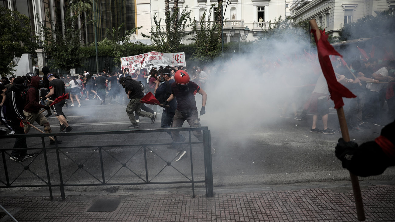 Διαδηλωτές χτύπησαν με τα κοντάρια τους τις κλούβες της Αστυνομίας που βρίσκονται έξω από τη Βουλή και οι αστυνομικοί έκαναν χρήση χημικών και κρότου λάμψης προκειμένου να τους απωθήσουν.Οι δρόμοι γύρω από το κέντρο παραμένουν κλειστοί, ενώ οι φοιτητές βρίσκονται αυτήν την ώρα έξω από τη Βουλή.