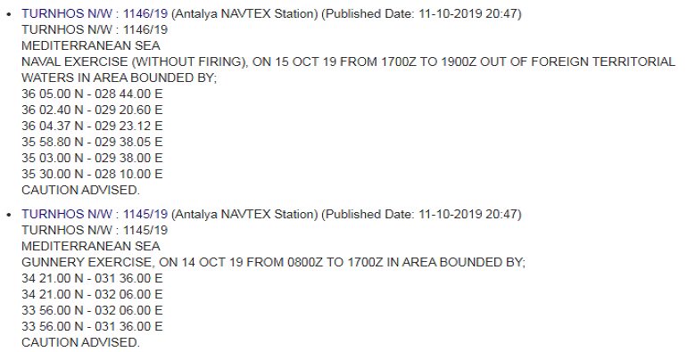 Οι Τούρκοι με δύο Navtex κλειδώνουν την περιοχή από το σύμπλεγμα της Μεγίστης μέχρι την Πάφο και πραγματοποιούν ναυτικές ασκήσεις 14 και 15 Οκτωβρίου, κάνοντας μία προβολή ισχύος σύμφωνα με το δόγμα «Γαλάζια Πατρίδα» στην Αν.Μεσόγειο.