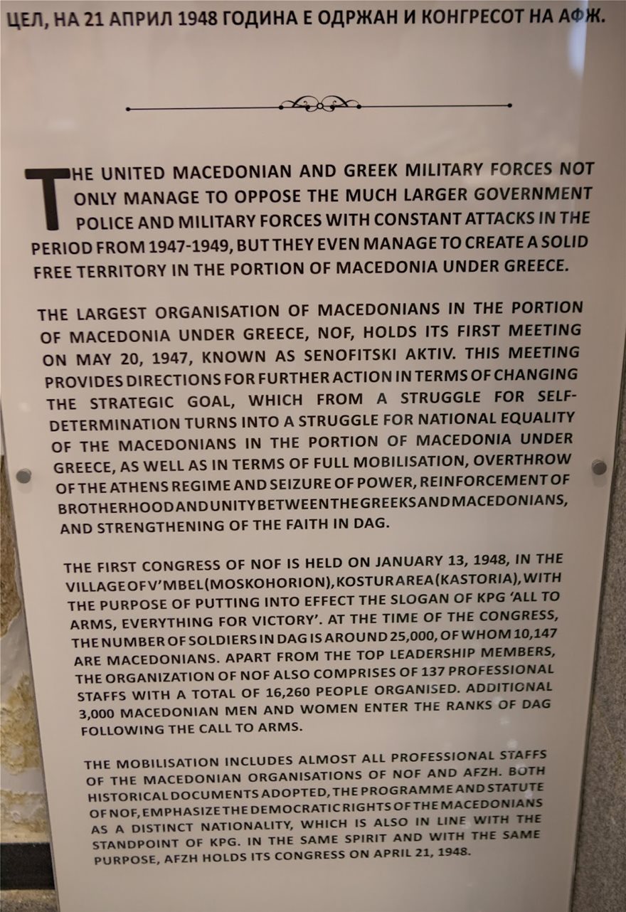 Η επίσκεψη στο αποκαλούμενο «Μουσείο Μακεδονικού Αγώνα», εντυπωσιάζει για το μέγεθος της προπαγάνδας, για τα ανεκδιήγητα εκθέματα. Απλοϊκοί ζωγραφικοί πίνακες μεγάλων διαστάσεων, ρεαλιστική αισθητική, κέρινα ομοιώματα, φωτογραφίες «Μακεδόνων ηρώων», όπως ο Βούλγαρος και σύμμαχος των Γενοκτόνων Νεότουρκων Γιάνε Σαντάνσκι να μπαίνει στη Θεσσαλονίκη και στην Καμάρα το 1912.Η καπήλευση, η κλοπή είναι ολοκληρωτική, ο «αλυτρωτισμός» εναντίον της Ελλάδας είναι παντού.