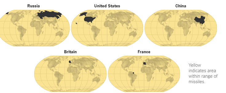 Σύμφωνα με τα στοιχεία που δόθηκαν στη δημοσιότητα και αναδείχθηκαν από τα κορυφαία αμερικανικά ΜΜΕ, οι πέντε χώρες που μπορούν να «απειλήσουν» με πυραύλους κάθε γωνιά του πλανήτη, είναι οι Ηνωμένες Πολιτείες, η Ρωσία, η Κίνα, η Βρετανία και η Γαλλία.