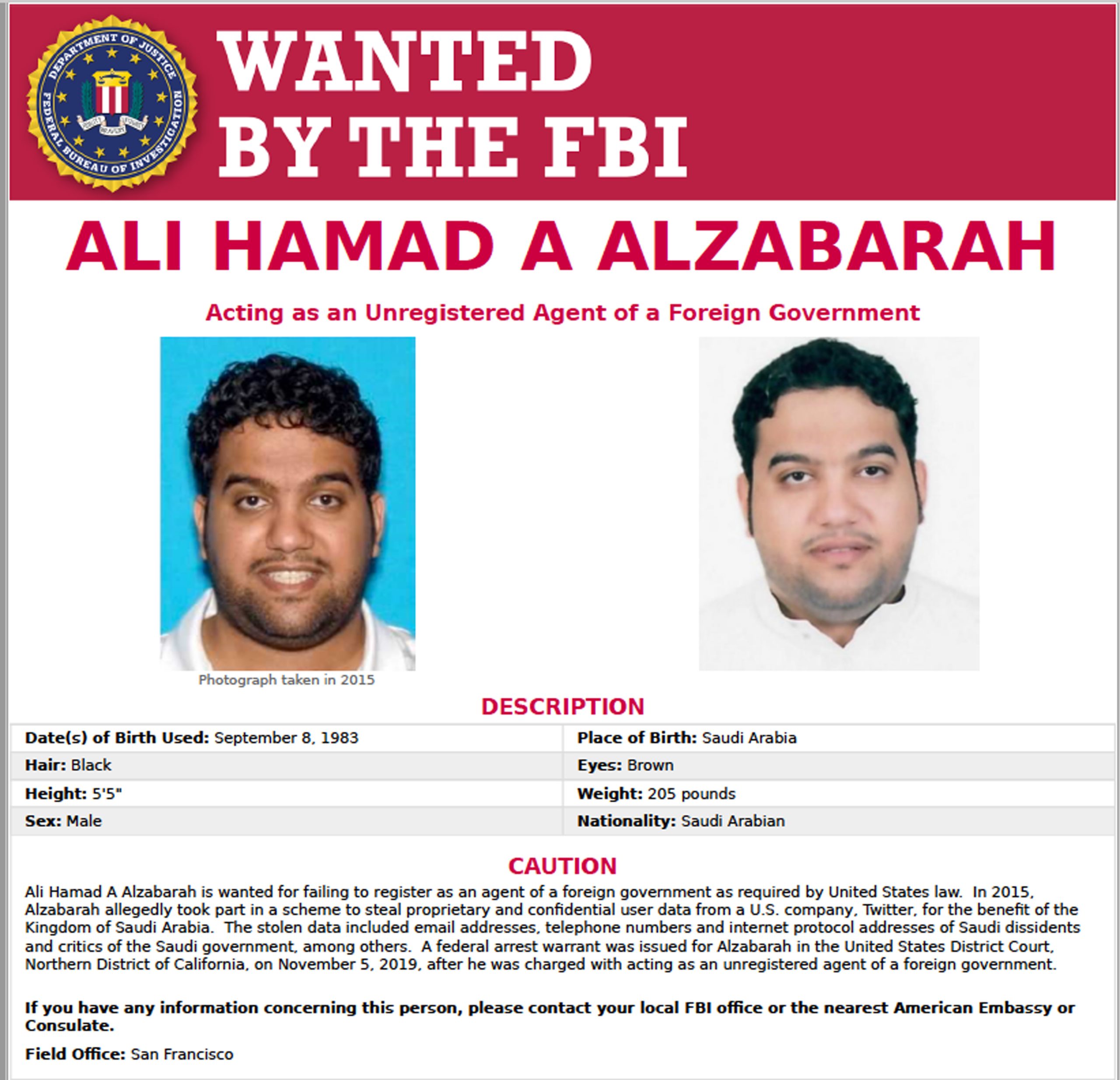 Οι εν λόγω υπάλληλοι, ο Αλί Αλζαμπάρα και ο Αχμέντ Αλμουτάιρι, βρίσκονται τώρα κατηγορούμενοι από τις ΗΠΑ ως πράκτορες της Σαουδικής Αραβίας χωρίς να έχουν γνωστοποιήσει την ιδιότητά τους στην αμερικανική κυβέρνηση.