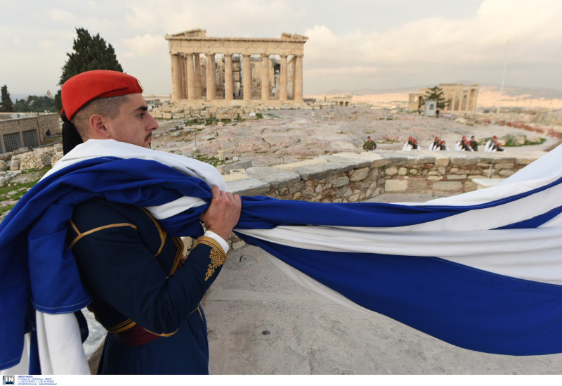 Εύζωνες ανέβηκαν το πρωί της 21ης Νοεμβρίου στην Ακρόπολη για την επίσημη έπαρση της σημαίας.