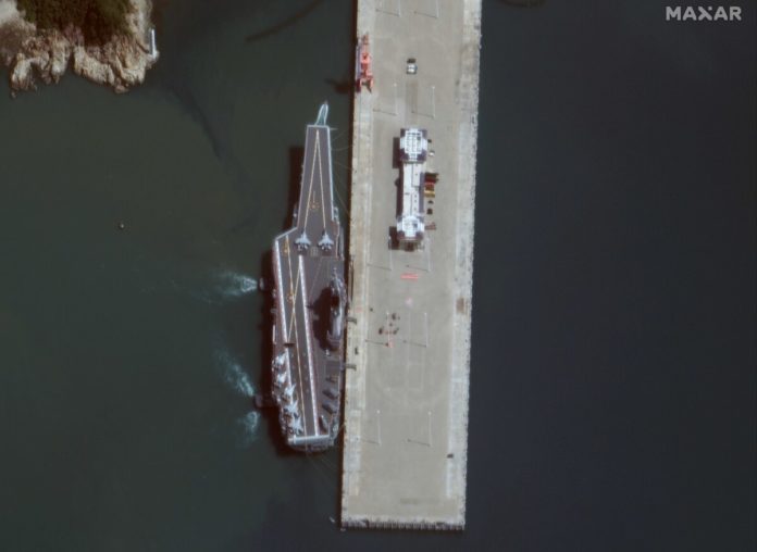 Δορυφορική εικόνα που δόθηκε στη δημοσιότητα από τη Maxar Technologies, δείχνει ότι το αεροπλανοφόρο Type 001A ελλιμενίστηκε στη ναυτική βάση Yulin, κοντά στην πόλη Sanya, στη νήσο Χαϊνάν.