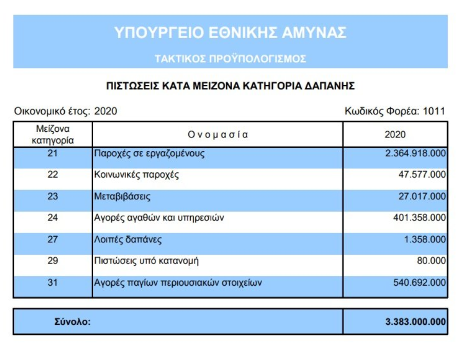 Για το ΥΠΕΘΑ, ο προϋπολογισμός 2020 περιλαμβάνει δαπάνες 3,397 δισ. ευρώ. (3,383,000,0000 τακτικές δαπάνες + 14.000.000 πρόγραμμα δημόσιων επενδύσεων)