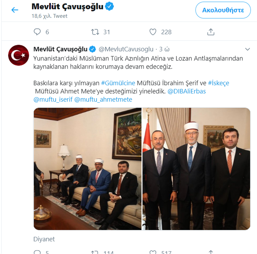Με ανάρτησή του στο Twitter o Τσαβούσογλου, δήλωσε πως η Τουρκία θα συνεχίσει να προστατεύει τα δικαιώματα της «Μουσουλμανικής Τουρκικής Μειονότητας» στην Ελλάδα, τα οποία απορρέουν από τις Συνθήκες της Αθήνας και της Λωζάνης(!), ενώ επανέλαβε την υποστήριξή του στους δύο ψευτομουφτήδες, αφήνοντας αιχμές κατά της Ελλάδας για καταπάτηση των δικαιωμάτων τους.