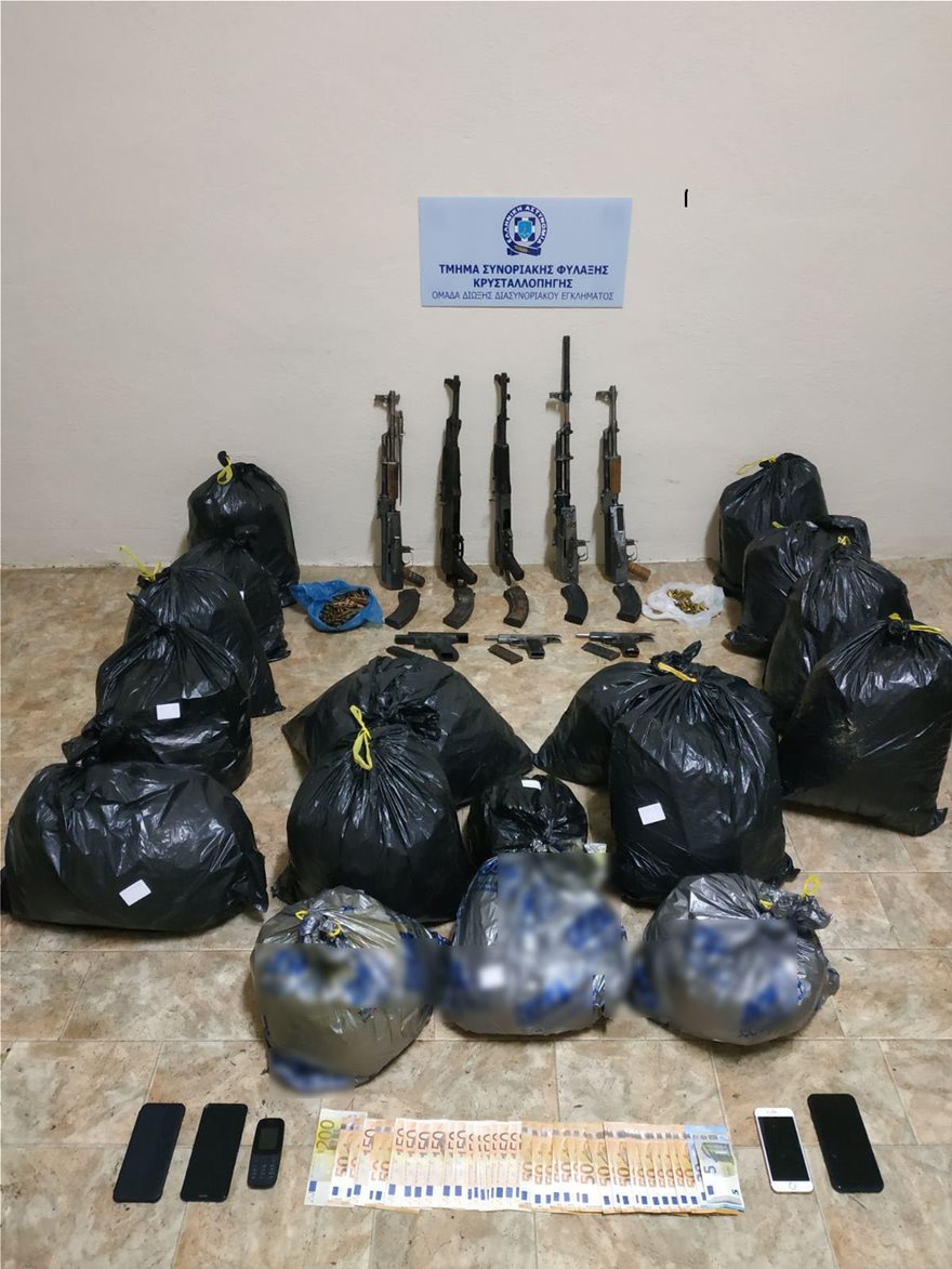 Οι αστυνομικοί του τμήματος Συνοριακής Φύλαξης Κρυσταλλοπηγής, ερευνούν το ενδεχόμενο εμπλοκής μιας σπείρας αλλοδαπών που έκρυβαν ένα οπλοστάσιο με πολυβόλα και Καλάσνικοφ σε ένοπλες ληστείες, στην πώληση οπλισμού και σε άλλα «βαριά» αδικήματα σε περιοχές της βόρειας Ελλάδας. Να αναφερθεί, πως οι συλληφθέντες είχαν στην ίδια υπαίθρια «καβάντζα» που διατηρούσαν και μεγάλη ποσότητα χασίς.