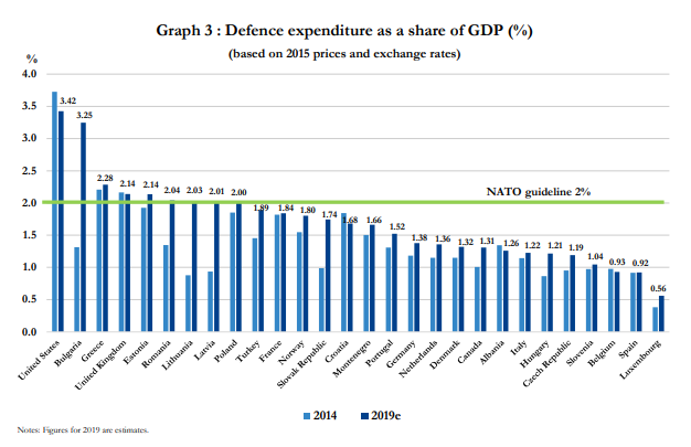 Σύμφωνα με τη νέα έκθεση του ΝΑΤΟ για τις δαπάνες στις αμυντικές δυνάμεις των χωρών η Ελλάδα βρίσκεται στις πρώτες θέσεις, από τις χώρες που ξοδεύουν τα περισσότερα χρήματα για τις στρατιωτικές τους επιχειρήσεις, μαζί με τις ΗΠΑ και τη Βουλγαρία. Οι τιμές που αναγράφονται στον σχετικό πίνακα βασίζονται στις τιμές του 2015.