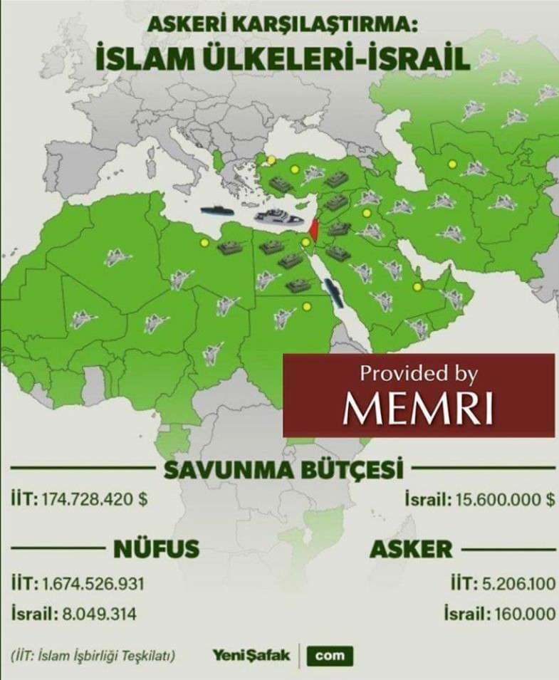 Μία από τις πιο πιστές στον Ερντογάν εφημερίδες της Τουρκίας, η YENI SAFAK, δημοσιεύει χάρτη με τον οποίο συγκρίνει τη δυναμική των Ενόπλων Δυνάμεων των ισλαμικών χωρών, σε σχέση με το Ισράηλ. Εννοείται ότι υπονοεί ανοιχτά ότι η Τουρκία θα πρέπει να ηγείται του ισλαμικού στρατού.